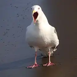 Steller's sea eagle is known to make a deep barking cry, ra-ra-ra-raurau. In aggressive interactions, its call is similar to the white-tailed eagles, but deeper.[31] During the display at the beginning of the breeding season, they have been heard to make calls to each other that sound like very loud, deep-voiced gulls.[31][37]