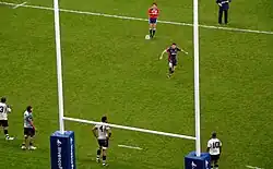 Stephen Jones kicking at goal during the Wales versus Fiji match of the 2011 Rugby World Cup