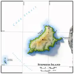Stephens Island (Māori: Takapourewa) is at the northernmost tip of the Marlborough Sounds in the South Island of New Zealand. It lies two kilometres to the northeast of Cape Stephens, the northernmost point of D'Urville Island. The island is 1.5 square kilometres (0.58 square miles) in size, and rises 283 metres (928 ft) high from the sea.[1]