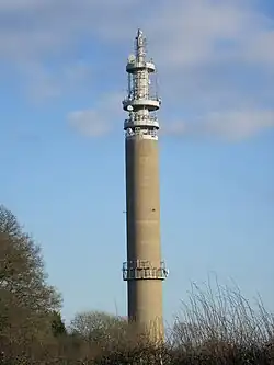 Stokenchurch BT Tower is a telecommunications tower built of reinforced concrete at Stokenchurch, Buckinghamshire, England. Reaching to 340.5 metres (1,117 ft) above mean sea level, it dates from 1963 and is 99.4 metres (326 ft) tall.[1] There are four platforms at the top that are used to attach microwave transmission drums and other antennas.