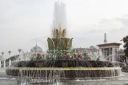 The Stone Flower Fountain was built in 1954. It was designed by the architect Konstantin Topuridze and carved by Prokopy Dobrynin.[1] The fountain was decorated with figures of birds, fruit and ears. Some sculpted details fountain created were carved by the sculptors Zoya Ryleyeva and V. V. Aleksandrova-Roslavleva, and the mosaics works were done in the workshop of the Soviet Academy of Arts. It was the first light and musical fountain in the USSR.[2] The music for it was created by Dmitri Shostakovich. It was positioned in front of the Ukrainian pavilion.[3]