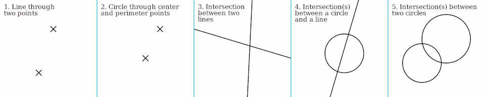 All straightedge-and-compass constructions consist of repeated application of five basic constructions using the points, lines and circles that have already been constructed. These are: