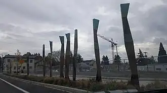 Stratum is a public art installation consisting of 23 multicolored sculptures, or "ecologically inspired geological totems", along the east approach to the Sellwood Bridge in southeast Portland's Sellwood neighborhood. The totems are 14 feet (4.3 m) tall and made of layered recycled materials intended to "create a surface representing earth, water and sky as a gateway to the Sellwood community".[1] They "rotate" at 90-degree angles. According to the Regional Arts & Culture Council, the project's concept was "driven by the power and beauty of the geologic and natural phenomena" of the Willamette Valley. It was funded by the City of Portland's art program. The sculptures are owned by the city and maintained by the Regional Arts & Culture Council.[1][2]
