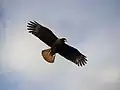 The striated caracara is 53 to 65 cm (21 to 26 in) long with a wingspan of 116 to 125 cm (46 to 49 in), and weighs about 1.2 kg (2.6 lb). The sexes' plumages are alike. Adults are mostly black to brownish black with white or tawny streaks on the upper back, neck, and breast. Their tail has a wide white tip, their underwing coverts and thighs are bright rusty rufous, and their primaries have white bases. The bare skin on their face is salmon pink to yellowish orange, their iris brown, and their legs and feet bright orange-yellow. Juveniles are black to brownish black with a chestnut tail and gray bare parts; they gradually attain adult plumage and bare skin colors over their first five years.[4][17]