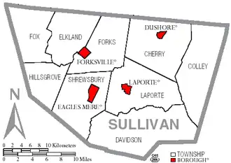 Under Pennsylvania law, there are four types of incorporated municipalities: cities, boroughs, townships, and, in at most two cases, towns. The following boroughs and townships are located in Sullivan County: