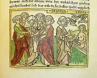 In the Italian Renaissance, the story appears in Boccaccio's book De mulieribus claris ("On Illustrious Women") (1361–1362). The Sulpicia of Boccaccio is, paradoxically, outstanding primarily for being unobtrusive. Her virtues are described in terms of "denial and restraint".[12] She is the model wife who confines her interests to the household and avoids gossip, dinner parties, dancing, cosmetics, and perfume. She speaks only when spoken to, and in Christian manner submits to sex with her husband only blushingly and for the sake of procreation.[12] Even her gaze is constrained, allowed to wander no further than the edges of her own dress.[12] Hers is one of only seventeen biographies of "good" wives among the total of 106 famous women Boccaccio sketches.[13]
