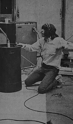 The Lovin' Spoonful recorded "Summer in the City" in March 1966 at Columbia Records' 7th Avenue Studio in New York City.[17][18] Erik Jacobsen produced the song with assistance from engineer Roy Halee.[17] The band completed the song across two sessions.[19] In the first session, they recorded the instrumental track in four steps. The basic track featured drums, an organ, electric piano and rhythm guitar.[20] John struggled to play the Wurlitzer electric piano part, prompting the arranger Artie Schroeck to step in as a session musician.[21][note 2] Boone overdubbed his bass guitar while John played autoharp, and a guitar was added on another layer.[23] The last instrumental overdub added extra percussion;[20] Halee placed a microphone inside a garbage can,[24] which Yanovsky then struck with a drumstick.[20] Halee described the resultant sound as "a gigantic explosion".[24]