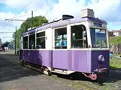 This tram was built in 1908 for Lanarkshire Tramways and she was used on services from Hamilton, Motherwell and Wishaw. In 1917, she was involved in a crash and was not used again in passenger service until 1921 when she was modified and rebuilt. She continued in service until 1931 when the tramway closed. Lanarkshire 53 was then sold to a farmer in Beith, Ayrshire, and was used as a hay store. By 1985, only the lower saloon body remained. Restoration was commenced on the bodywork at the Bo'ness and Kinneil Railway until June 1988, when she came to Summerlee. The truck and running equipment came from Porto 150 (see above), whilst the platforms and upper-deck seats/railings and steps were all made at Summerlee. On 1 April 1995 the tram was launched into passenger service by Helen Liddell MP.[3] |
