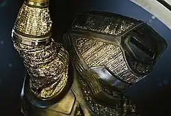 The gold-leaf shielding in Sunshine was influenced by NASA satellite designs for deflecting heat and other forms of radiant energy. Boyle designed the gold-coloured space suits along these lines despite persistent encouragement to model them after the NASA template. The helmets were designed to have cameras mounted in them. This further enhanced a sense of claustrophobia useful to the actors in delivering more heartfelt performances.[31] The helmets were also limited to a horizontal slit for visibility instead of a full-face visor as further consideration toward protecting the characters from the ambient radiation of outer space.[40] According to Boyle, the funnel shape of the helmet was influenced by the character Kenny from South Park.[31]