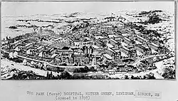 During the nineteenth century the Metropolitan Asylums Board (MAB) built a number of fever hospitals around London.[3] While patients received medical care they were removed from crowded neighbourhoods and isolated to help prevent epidemics. These hospitals were for working-class people from poor quality urban housing. More prosperous patients would generally be nursed at home.[2] Hospital buildings had separate wards, which were often separate blocks, for different illnesses, and they were designed to provide plenty of fresh air with lofty ceilings and "airing courts" where patients could spend time outside, in sunshine as far as possible.[4]