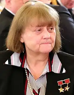Svetlana Yevgenyevna Savitskaya (Russian: Светла́на Евге́ньевна Сави́цкая; born 8 August 1948) is a Russian former aviator and Soviet cosmonaut who flew aboard Soyuz T-7 in 1982, becoming the second woman in space. On her 1984 Soyuz T-12 mission she became the first woman to fly to space twice, and the first woman to perform a spacewalk.