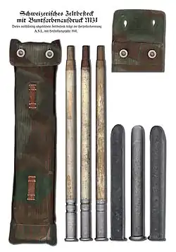 The official name is the Swiss army tent 01 and tent 64. The number in each case represents the year of introduction (1901 and 1964). The two models differ in camouflage and button arrangement. They are sewn or riveted to the Militärblachen, and very old models have the buttons on a strong string attached so that a button can be used on both sides - the button can be pulled through the loop to the opposite side.