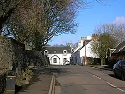 Hugh Glover held the lands of Townend circa 1701-4 and in 1733 William Kelso of Dankeith sold the lands to George Boyd of East Overloan Farm. William Hay Boyd, Esq. of Her Majesty's 20th Regiment of Infantry in the Crimea[29] and was the owner of Townend House (NS 37652 31552) and estate in 1839.[24] Townend is an 18th-century building with a Victorian Italianate wing. A dated lintel in the walled garden may have come from an earlier building on the site; the old stables, were converted into a small dwelling in the 1960s.[30] In recent times Townend Cottage has functioned as a nursing home,[16] Townend Cottage, circa 1810, situated in the village was its former dower house. The Hay-Boyds gave land for the village hall, a school, and a garden next to the church.[29]