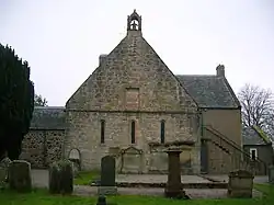 The parish church was founded in the 12th century by Simon Loccard and is the oldest functioning church in Ayrshire.[16] It belonged to the Trinitarian Monastery at Fail (just outside Tarbolton). The Church was restored in the 18th century and again in 1919. This restoration by P. MacGregor Chalmers[16] revealed that the earlier alterations of 1797[17] had covered up some fine architectural features, including the 13th century windows[13] and the open-work timber roof. Three windows with semi-circular heads are located in the gable, with heavy hood moulds and dog-tooth ornamentation, the finest of their style in Scotland.[16] The base slab of an aumbrey incorporating a piscina sits as the sill of a south-facing window.[16]