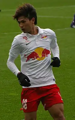 In the 2015–16 season, Minamino made a good start to the season when he scored his first goal of the season, in a 7–0 win over Deutschlandsberger SC in the first round of the Austrian Cup.[55] He then scored five goals throughout August, starting with a brace against SV Ried, Dinamo Minsk in the UEFA Europa League campaign and Sturm Graz.[56] In a 4–2 win over SV Grödig on 12 September 2015, Minamino scored a brace before setting up the club's fourth goal of the game.[57] He then scored two goals in two matches between 4 October 2015 and 17 October 2015 against Rapid Wien and FC Admira Wacker Mödling.[58] However, Minamino suffered a goal drought for the next four months and it was finally ended on 28 February 2016 when he scored in a 4–1 win over Austria Wien.[59] He later scored two more goals later in the 2015–16 season.[60] Minamino then helped the side win the league for the second consecutive time in his Red Bull Salzburg career.[61] Twelve days later after helping the side win the league, he came on as a substitute in the second half in the final of the Austrian Cup.[62] At the end of the 2015–16 season, Minamino went on to make 40 appearances and scoring 13 times in all competitions.