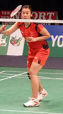 Tang Jinhua's most successful years were 2013 and 2014. 2013 brought her solid if not spectacular results with Ma Jin as they finished second to Chinese compatriots at the Super Series Premier Korea Open, the China Masters Super Series, and the Badminton Asia Championships, and to a Korean pairing at the German Open, before claiming victory at the Yonex Open Japan Super Series in September.[13] However, at the end of 2013, Tang and Ma lost the final of the Super Series Masters Finals to Danish pair Christinna Pedersen and Kamilla Rytter Juhl.[14] Tang's results with Ma Jin, however, were completely overshadowed by her success with new partner Bao Yixin beginning in October 2013. In rapid succession the two 21-year-olds claimed titles at the Dutch Open Grand Prix, the Denmark Super Series Premier, the French Super Series, the Hong Kong Super Series and the Macao Open Grand Prix Gold, all before the end of the year. Of the first 28 matches they played the new pairing lost only once. In first four months 2014, Tang Jinhua & Bao Yixin won the Korea Open Super Series, the Malaysia Super Series Premier, the Swiss Open Grand Prix Gold and the Singapore Super Series.[15][16] Tang Jinhua was also part of the Chinese Uber Cup winning team in 2014. Together with Women's Doubles partner Bao Yixin she reached the number one spot of the BWF World Ranking on 29 May 2014.[17]