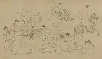 Eight Immortals of the Wine Cup, depicting few of the prominent poets of the Tang Dynasty, such as He Zhizhang, Li Jin, Li Shizhi, Li Bai, and Zhang Xu.
