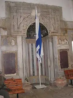 Its entrance is set inside a tall portal, considered "one of the finest niche-headed doorways in Jerusalem". Its elements are a combination of geometric precision and free-hand irregularity.[10] The top of the recess is a niche-like semi-dome covered with radiating flutes that merge into chevrons. The flute carving "is so delicate as to necessitate very fine joints between the voussoirs, and these have been most carefully set out".[10] The lower part of the semi-dome has three courses (rows) of muqarnas;[11] the lowest course features two shell ornaments "to give interest to the re-entering angles".[10]