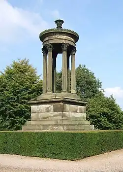 The first formal gardens were created around the early 18th-century house and consisted of a walled garden to the south of the house, a formal semicircular pond to its north and formal lines of trees to the east and west. Later Samuel Wyatt set out an avenue of beeches to the south, which is now the Broad Walk.[3] An arboretum was created during the 18th century and additions have been made to it since. The earliest reference to the arboretum is in 1795 when between five and ten species were present.[4] The first formal garden to be created for the present house was Charlotte's Garden, designed by Lewis Wyatt in 1814. Lewis also designed the sandstone Conservatory, which was originally joined to the house by a glass passageway.[5] This was also known as the Orangery because for a time it was used for growing oranges.[6] In the 1830s, a copy of the Choragic Monument of Lysicrates in Athens was placed at the end of the Broad Walk. Gardens were established along the sides of the Broad Walk, including the Leech Pool and the area containing the Golden Brook.[7]