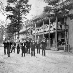 J.S. Halsey built a two and a half story hotel in 1850, known variously as the Cataract Hotel or Taughannock House (or simply as Halsey's Hotel) at the Taughannock Falls Overlook.[7][8] Visitors could reach the hotel by taking a train to Cayuga Lake, take a steamboat across the lake to Goodwin's Point, then finally board a stagecoach to reach the hotel.[9] The hotel site today is the location of the park visitor center and parking lot.[8]