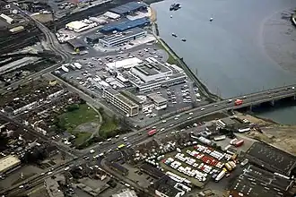 One unusual feature of the site was the railway line that ran through the car park; this linked the British Rail sidings at Northam to Driver's Wharf where scrap metal was loaded into ships. It was operated by a venerable 0-4-0 diesel shunter. In 1984, the line fell into disuse as the scrap was now delivered by road.[5] The tracks were then tarmacked over to provide extra car parking spaces. The line featured in the first episode of Saturday Banana with a steam locomotive, Bonnie Prince Charlie, from the Great Western Society at Didcot.