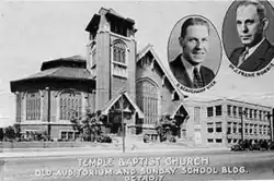 The church was first known as the Fourteenth Avenue Baptist Church when it opened in 1917 by the Fourteenth Avenue Baptist Society, founded in 1892. In 1921 the Fourteenth Avenue Baptist Society merged with the Grand River Avenue Baptist Church; the combined church became Temple Baptist Church. The congregation consisted mostly of white southerners who had moved to Detroit seeking employment. In 1934 Temple Baptist Church invited leading fundamentalist Rev. J. Frank Norris to serve as pastor. J. Frank Norris simultaneously pastored his home church, First Baptist Church of Fort Worth Texas, flying himself between Fort Worth and Detroit.[2] In 1950, after internal feuding, George Beauchamp Vick became pastor and remained so after the church moved to new location on Grand River Avenue. In 1968, the third Temple Baptist Church opened in Redford Township, at 23800 West Chicago (now Detroit World Outreach). After the death of G. Beauchamp Vick, Temple Baptist was pastored by A.V. Henderson and then by Truman Dollar until his death by suicide in the 1996. Brad Powell was then called in as pastor in 1990 and the church changed its name to Northridge Church after it was relocated to Plymouth Michigan.