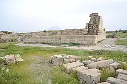 The Temple of Anahita is a large rectangular room in the shape of a cube in a depression 6 meters above the ground, each side of which is nearly 14 meters. It is built of carved stones without mortar, double-walled, and in the Achaemenid architectural style. These stones are connected to each other with iron fasteners. A staircase from the palace was also connected to this temple. The temple has no roof and the purpose was to bring the water of the Shapur River, which flows 250 meters away, into the temple, so that after flowing inside the temple, it would be discharged through a Qanat.[8][9]