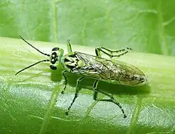 Tenthredinidae is the largest family of sawflies, with well over 7,500 species worldwide,[2] divided into 430 genera. Larvae are herbivores and typically feed on the foliage of trees and shrubs, with occasional exceptions that are leaf miners, stem borers, or gall makers. The larvae of externally feeding species resemble small caterpillars. As with all hymenopterans, common sawflies undergo complete metamorphosis.