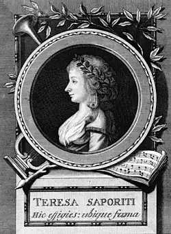 Saporiti was born in Milan. Little is known about her early life, but in 1782 she and her elder sister Antonia were engaged by the impresario, Pasquale Bondini, to sing with his Italian opera company in Leipzig. According to The Cambridge Mozart Encyclopedia (and several other sources), Theresa and Antonia may have been the sisters of opera singer Caterina Bondini (born as Caterina Saporiti), who was the first Zerlina in Don Giovanni and Pasquale Bondini's wife.[2] Antonia abandoned her career early on and died in Milan in 1787.[3] Teresa, however, stayed with the company until 1788 and performed with them in Leipzig, Dresden and Prague, most famously as Donna Anna in the 1787 world premiere of Don Giovanni. She was an attractive woman, and several authors have speculated that Don Giovanni's emphatic line in the act 2 dinner scene, "Ah che piatto saporito!" (Ah, what a tasty dish!) is a punning reference to Saporiti.[4]