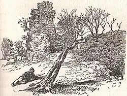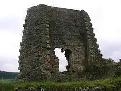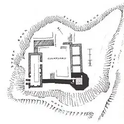 The small, irregular, octangular 14th-century vaulted tower has a splayed base[4][5] and is constructed of courses of square ashlar masonry,[6] 6 m (20 ft) high, with walls 2 metres (6.6 ft) thick, is the earliest part of the structure, together with the wide wall at the north-west. The tower was vaulted, with three ribs, and an entrance from the courtyard via a narrow passage leading to a partly surviving wheel-stair.[4] The remains of outbuildings lie to the north and a well was recorded within the keep; a sizeable courtyard lay within the complex.[7] The remains have seen some restoration[8] and the lines of excavation trenches are apparent. The whereabouts of the records of the late 19th-century excavations is not known for certain.[9]