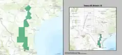 Texas's 15th congressional district of the United States House of Representatives includes a thin section of the far south of the state of Texas. The district's current Representative is Republican Monica De La Cruz. Elected in 2022, De La Cruz is the first Republican and woman to represent the district.