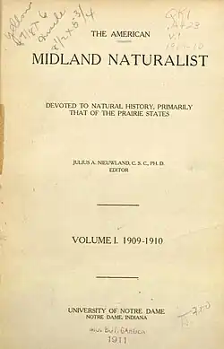 The American Midland Naturalist was a quarterly peer-reviewed scientific journal covering natural history. It was established in 1909 by Julius Nieuwland and was published by the University of Notre Dame.[1] According to the Journal Citation Reports, the journal had a 2013 impact factor of 0.621.[2]