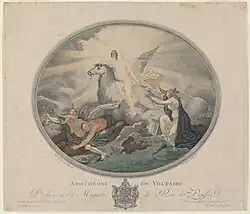 There is also a different painting now in the collection of the Musée Carnavalet by Robert-Guillaume Dardel which is known both as “Allegory to the glory of Voltaire” (French: Allégorie à la gloire de Voltaire) and as “The Apotheosis of Voltaire”.[9][6] A figure astride a winged horse lifts off a mask with Voltaire's face to reveal himself as Apollo. Personifications of perhaps Ignorance and Envy fall back from the horse's hoofs, while a female figure, possibly Paris or Truth, reaches out to him on the other side.