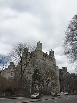 The lowest three stories of the facade are made of rusticated blocks of limestone, while the rest of the building is clad with beige brick. The facade's primary elevations face south toward 81st Street and east toward Central Park West.[25][26] This design was intended to take advantage of the building's placement next to the AMNH and Central Park.[25] The north elevation on 82nd Street is simpler in design than the primary elevations, while the west elevation is not decorated.[28] The north, south, and east elevations contain terracotta ornamentation such as pilasters, broken pediments, balustrades, obelisks, and cartouches.[25] There are also motifs such as angels, dolphins, and rams' heads.[1][35] The corners of each elevation are articulated by vertical bands of brick quoins.[25] There are horizontal band courses above the 9th, 12th, and 13th stories; each band course consists of two molded terracotta bands.[28]