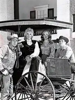 L-R: Linda Evans, Barbara Stanwyck, Richard Long, Peter Breck, Lee Majors, and Charles Briles (1965)