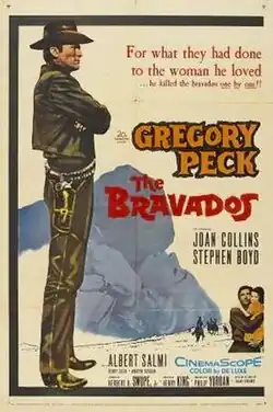 The Bravados is a 1958 American Cinemascope Western film (color by DeLuxe) directed by Henry King, starring Gregory Peck and Joan Collins. The CinemaScope film was based on a novel of the same name, written by Frank O'Rourke.[2]