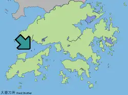 The group of islands lie in the north of Lantau Island, midway between Chek Lap Kok, where Hong Kong International Airport is located, and Tuen Mun. West Brother and East Brother are 550 m by 430 m and 800 m by 180 m respectively. Before being leveled, they had maximum elevations of 68 m and 63 m.[1] Tsz Kan Chau (or Reef Island, 匙羮洲), a tiny island nearby, is often regarded as a member of the group.