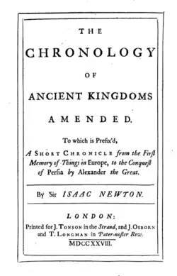 1. ^ Newton, Isaac (1728). The chronology of Ancient Kingdoms Amended : To Which is Prefix'd, A Short Chronicle From the First Memory of Things in Europe, to the Conquest of Persia by Alexander the Great (1 ed.). London: Printed for J. Tonson; J. Osborn; T. Longman. doi:10.3931/e-rara-37430.