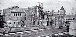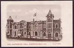 The Agricultural and Industrial Hall, also known as the Canterbury Hall, was built in 1900 at 192–194 Manchester Street.[1][2][3] The foundation stone was laid by Mayor William Reece on 14 March 1900.[4] William Clarkson and Robert Ballantyne, architects trading as Clarkson & Ballantyne, designed the building for the 50th jubilee of Christchurch, celebrating the arrival of the First Four Ships in December 1850.[3][5] The contractors were Rennie and Pearce.[4] The Canterbury Industrial Association, a branch of the New Zealand Industrial Association, was the driving force behind the building.[6] Together with the Agricultural and Pastoral Association, an Agricultural and Industrial Hall Company was formed that owned the building.[4][6] Samuel Brown, the president of the New Zealand Industrial Association, called it "possibly the finest hall in New Zealand".[6]