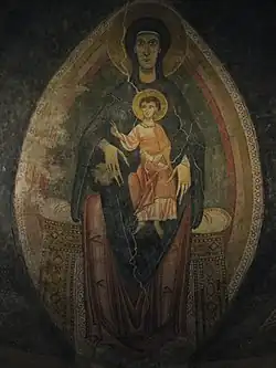The apse consists of a broad arch leading to a barrel vault, and culminates with a half-dome.[136] The capitals at the entrance contain representations of the Adoration of the Magi and Daniel in the lions' den.[137] The piers show Martin of Tours on the left and the angel Gabriel announcing to The Virgin on the right. The chapel includes other, mostly contemporary, medieval artwork. They include, in the dome, a large fresco dating to between 1130 and 1150, from the Spanish Church of Sant Joan de Tredòs. The fresco's colourization resembles a Byzantine mosaic and is dedicated to the ideal of Mary as the mother of God.[138] Hanging within the apse is a crucifix made between about 1150 to 1200 for the Convent of St. Clara in Astudillo, Spain.[139] Its reverse contains a depiction of the Agnus Dei (Lamb of God), decorated with red and blue foliage at its frames.[140] The exterior wall holds three small, narrow and stilted windows,[137] which are nevertheless designed to let in the maximum amount of light. The windows were originally set within imposing fortress walls; according to the art historian Bonnie Young "these small windows and the massive, fortress-like walls contribute to the feeling of austerity ... typical of Romanesque churches."[136]