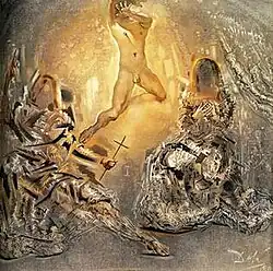 He was by this time an international star and able to secure an audience with Pope Pius XII.[3] By the late 1950s, both religious and cosmic matters preoccupied his work while his canvases became especially large, as if, according to author Kenneth Wach, he was "motivated by a desire to match such admired historical antecedents as the Spanish artists Murillo, Velázquez, and Zurbarán, and thereby to secure his place in the art of the century".[4] When a new pope was being considered in 1958, Dalí was an enthusiastic supporter of Angelo Giuseppe Cardinal Roncalli, to the extent that Roncalli's ear became the subject of his trompe-l'œil composition The Sistine Madonna (1958).[5]