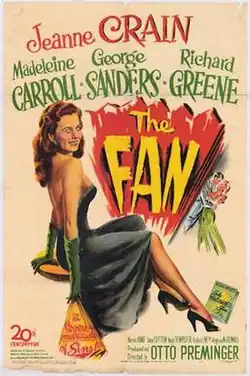 The Fan is a 1949 American drama film directed by Otto Preminger, starring Jeanne Crain, Madeleine Carroll, George Sanders, and Richard Greene. The screenplay by Dorothy Parker, Walter Reisch, and Ross Evans is based on the 1892 play Lady Windermere's Fan by Oscar Wilde. The play had been filmed several times before, with a 1916 silent film, a later adaptation by Ernst Lubitsch in 1925 as well as versions in Spanish and Chinese.