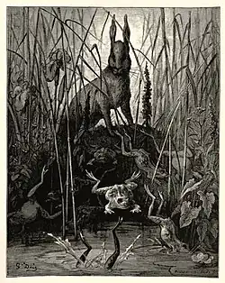 Hares are proverbially timid and a number of fables have been based on this behaviour. The best known, often titled "The Hares and the Frogs", appears among Aesop's Fables and is numbered 138 in the Perry Index.[1] As well as having an Asian analogue, there have been variant versions over the centuries.