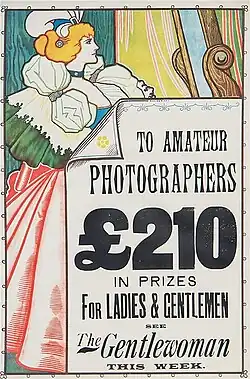 In 1898, preference shares in the paper were listed on the London Stock Exchange.[14] Also in 1898, the Grafton Galleries hosted an exhibition of the winning images from the paper's photographic competition, open to amateur photographers only. The Gentlewoman had offered two hundred guineas in prizes, equivalent to £29,548 in 2023, and the judges were H. P. Robinson, Viscount Maitland, and the Rev. F. C. Lambert.[15]