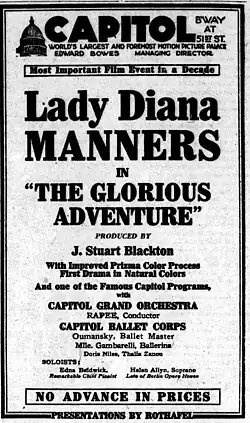 The Glorious Adventure is a 1922 British Prizmacolor silent feature film directed by J. Stuart Blackton and written by Felix Orman.[1] The film's sets were designed by Walter Murton.[2][3] It was shot at the Cricklewood Studios of Stoll Pictures in London.[4]