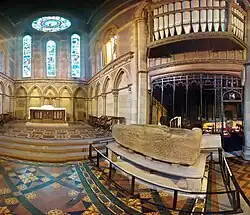 The Govan Sarcophagus is a monumental stone coffin with an ornately carved exterior; it was rediscovered when the church sexton was digging a grave in the south-east corner of the churchyard in December 1855,[25] surrounded by roots from two elm trees.