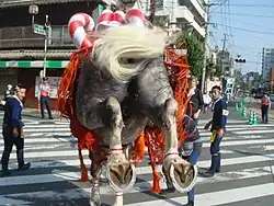 The origin of Boshita is not known; decorated horses were not employed, and there was no horse chasing at the time of Katō Kiyomasa. A view states that it had been used since the First Sino-Japanese War. The use of Boshita was claimed at the time of world exhibition at Osaka in 1970, since Japanese of Korean origin felt miserable at the time of the festival. New shouting phrases have been up to the groups which participate; it was decided upon in August 1990.[1]