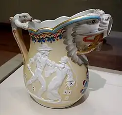 It inspired a series of west coast songwriters, for example, to produce songs which looked at Chinese immigrants through negative stereotypes and questioned their place in America. Some used Harte's poem word-for-word.[20] In November 1875, Union Porcelain Works in Long Island announced the release of a pitcher decorated with figures from "The Heathen Chinee". The title character was depicted with four aces falling from his sleeve.[21]