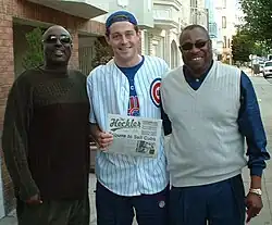Founder of The Heckler poses in 2003 with Cubs coach Gary Matthews (left) and manager Dusty Baker (right).