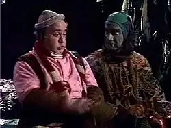 The play featured Zinovy Gerdt as "the professor" (a narrator stand-in for Tolkien), Mikhail Danilov as Bilbo Baggins, Anatoly Ravikovich as Thorin Oakenshield and Igor Dmitriev as Gollum. Smaug and the Mirkwood spiders were portrayed by puppets. Missing in this version are the trolls, Elrond, Beorn and the wood-elves. The goblins were human-like with little makeup, and were portrayed by dancers from the Leningrad State Academic Opera and Ballet Theatre, as are the inhabitants of Lake Town.[2]